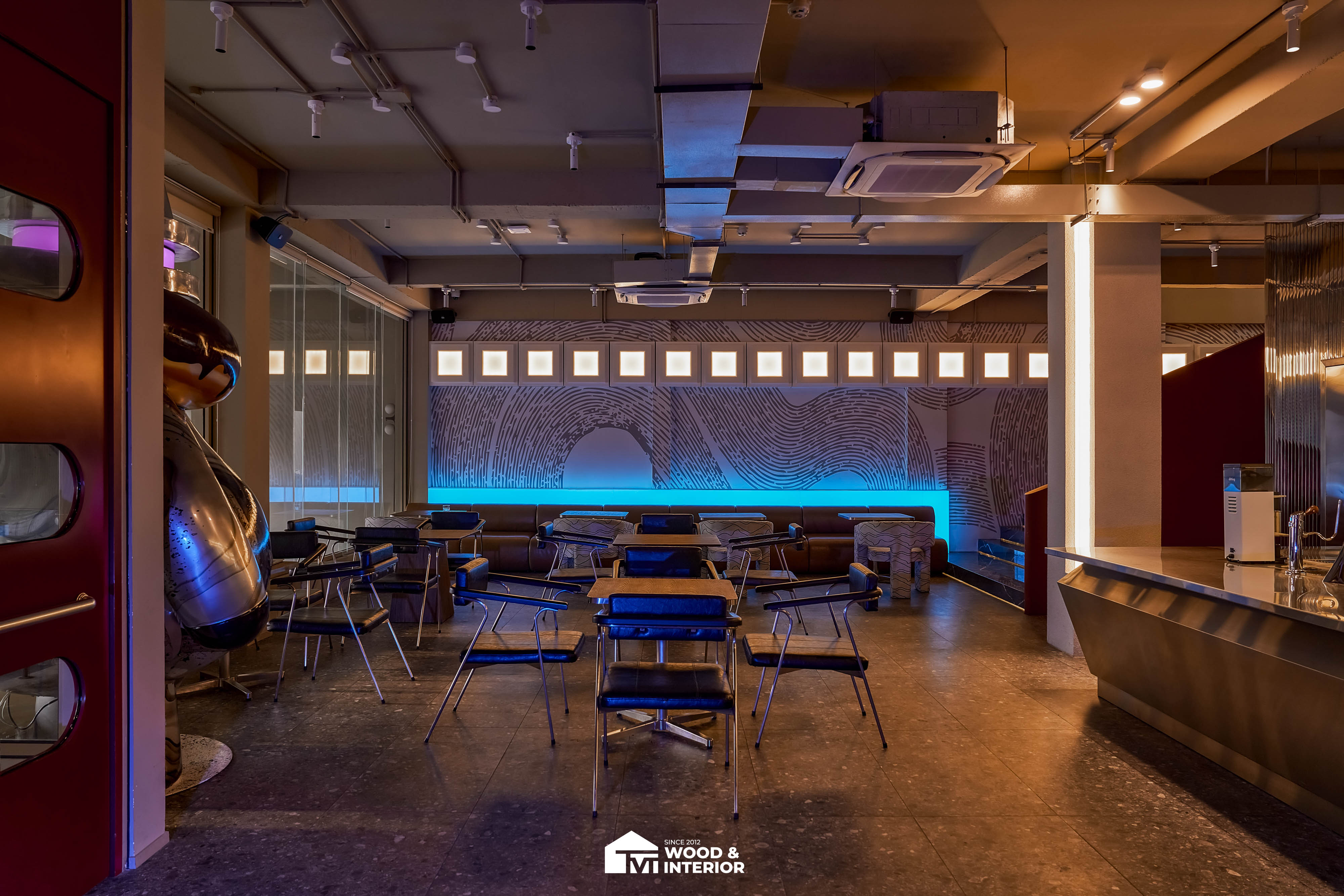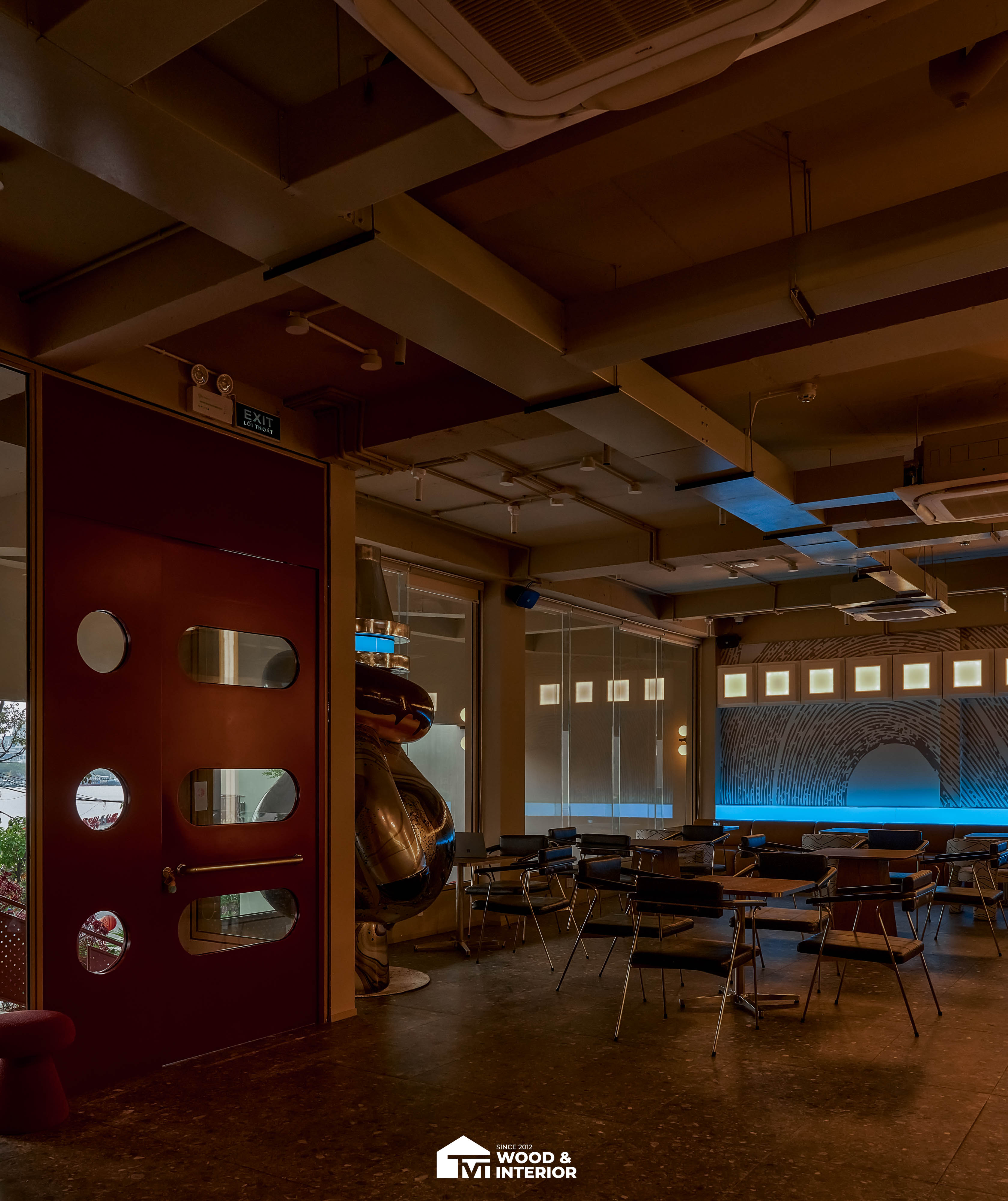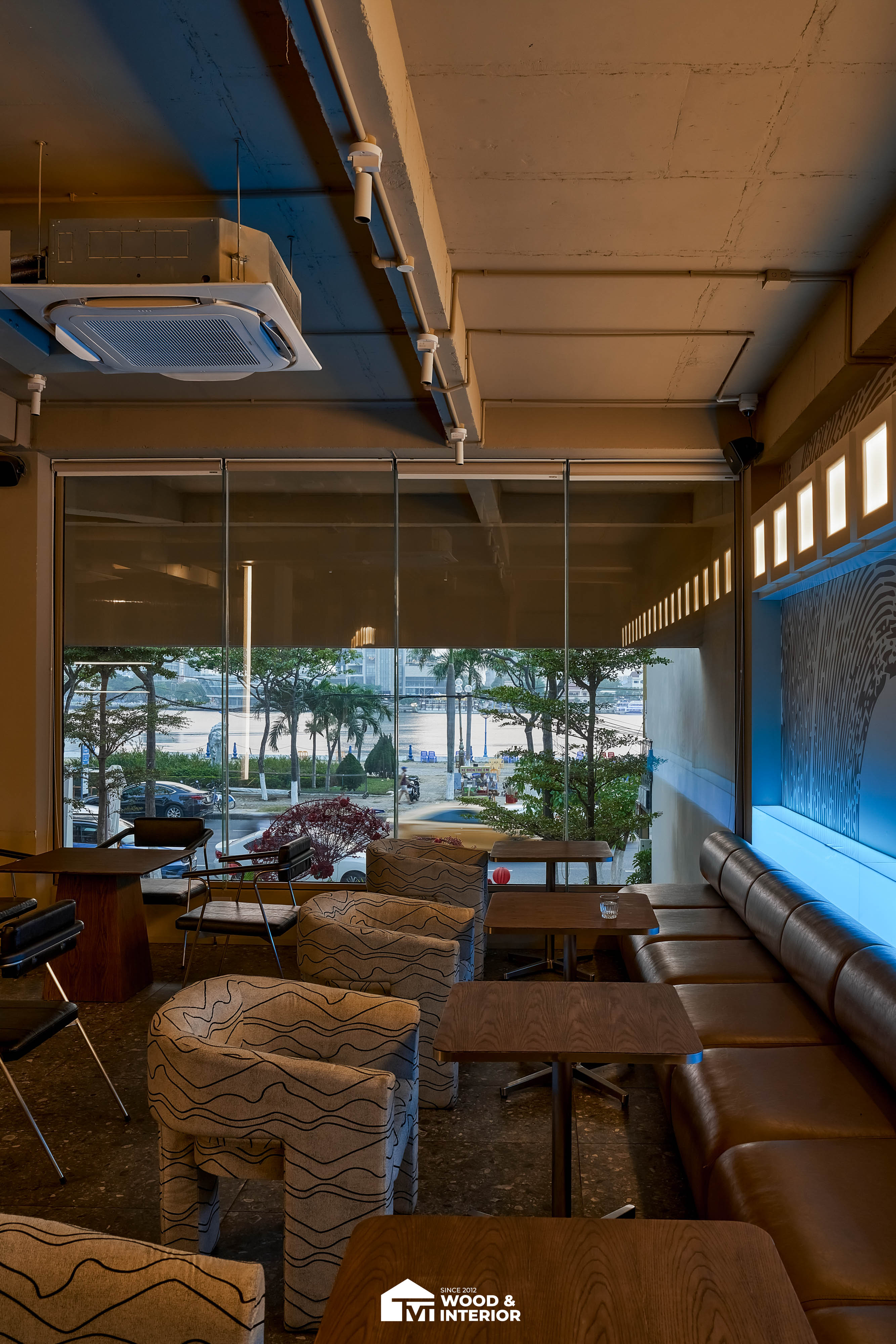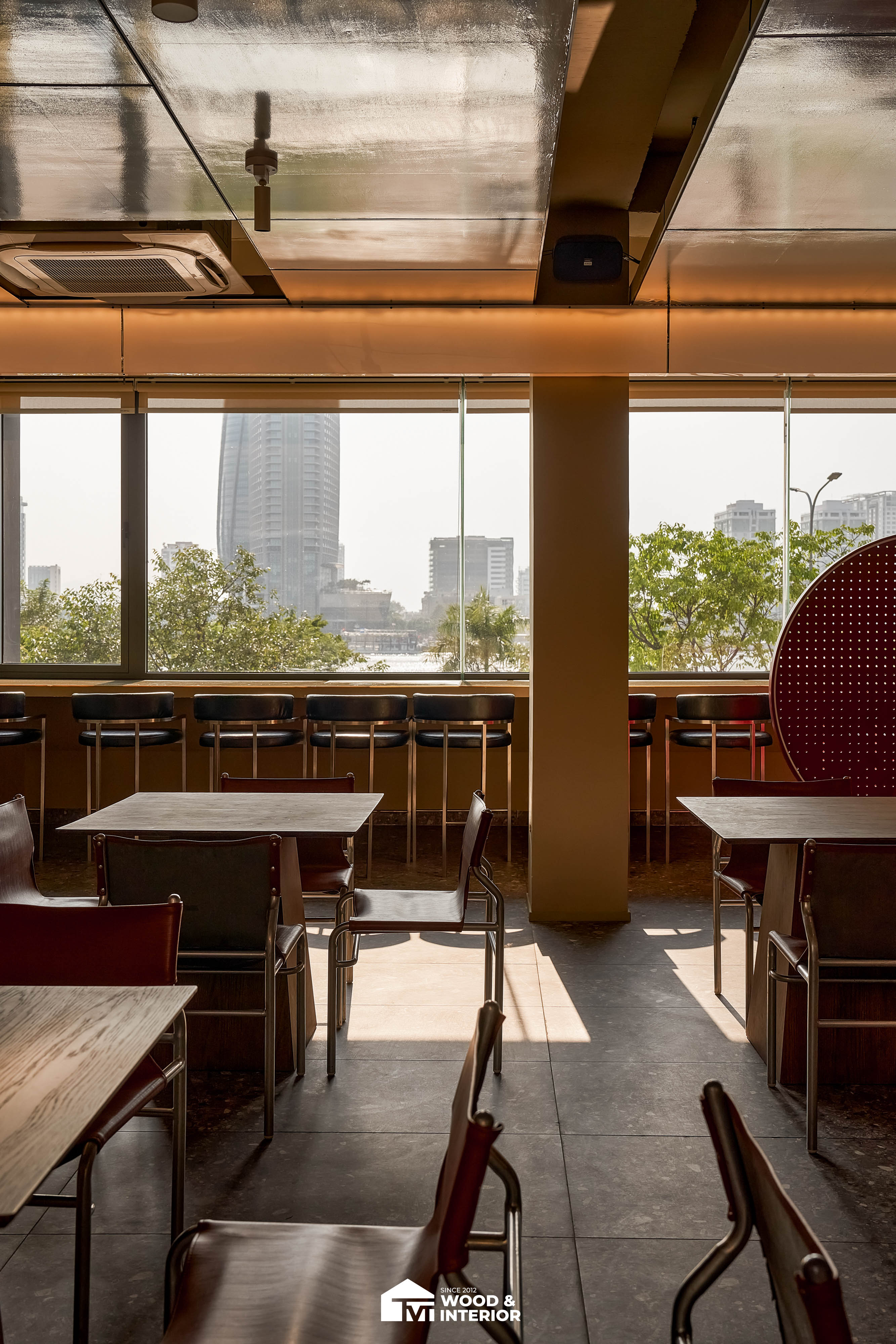 Điểm nhấn của dự án nằm ở các hạng mục nội thất trang trí đòi hỏi độ hoàn thiện sắc sảo. TVT trực tiếp sản xuất và lắp đặt hệ thống bàn ghế với đa dạng chất liệu, kiểu dáng độc đáo, đảm bảo sự kết nối hoàn hảo giữa công năng sử dụng và thẩm mỹ thị giác. Đặc biệt, phần trần inox gương và các mảng tường đồ họa Pop-Art được xử lý tỉ mỉ, tạo nên một tổng thể không gian phản chiếu ấn tượng hướng ra phía sông Hàn.
