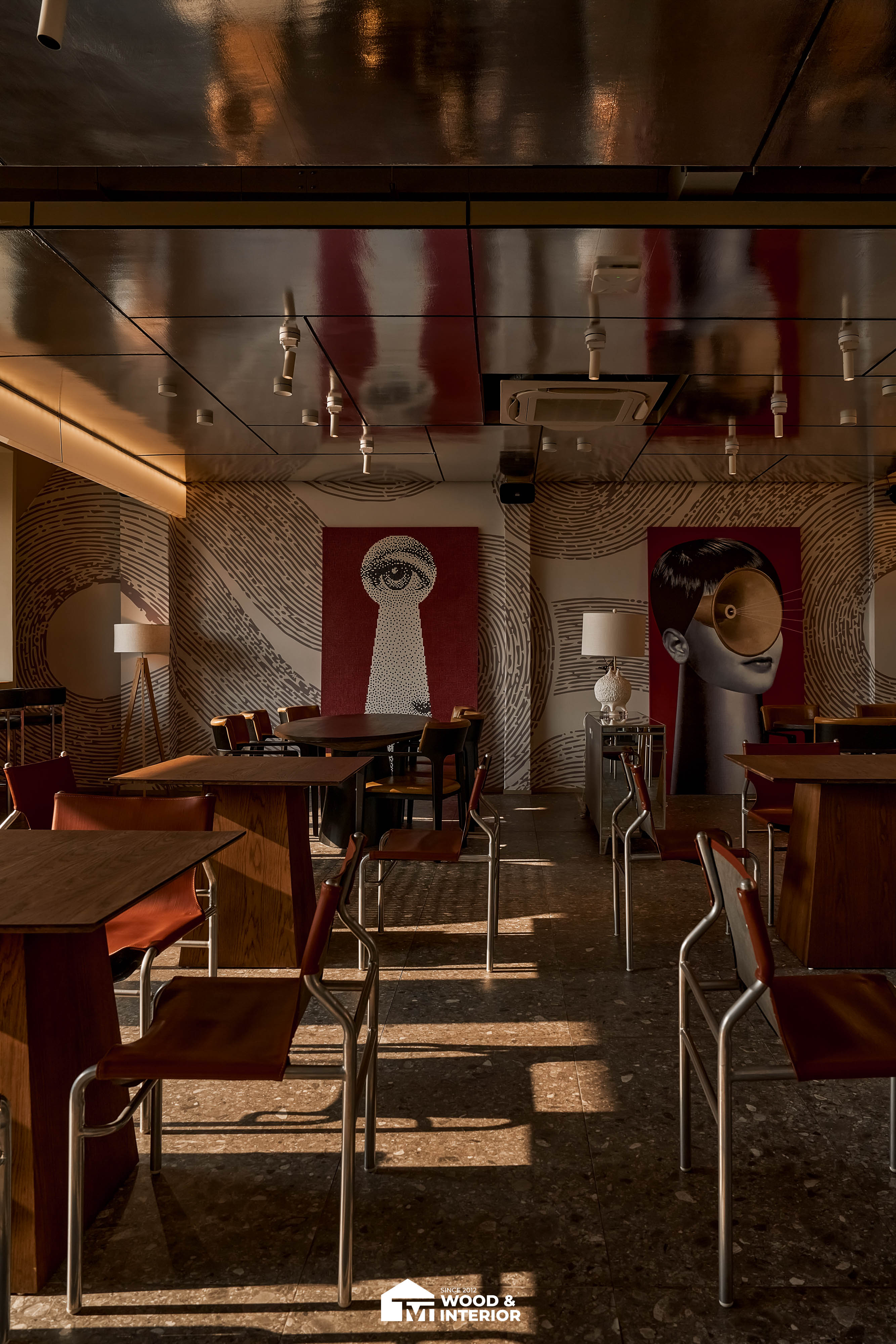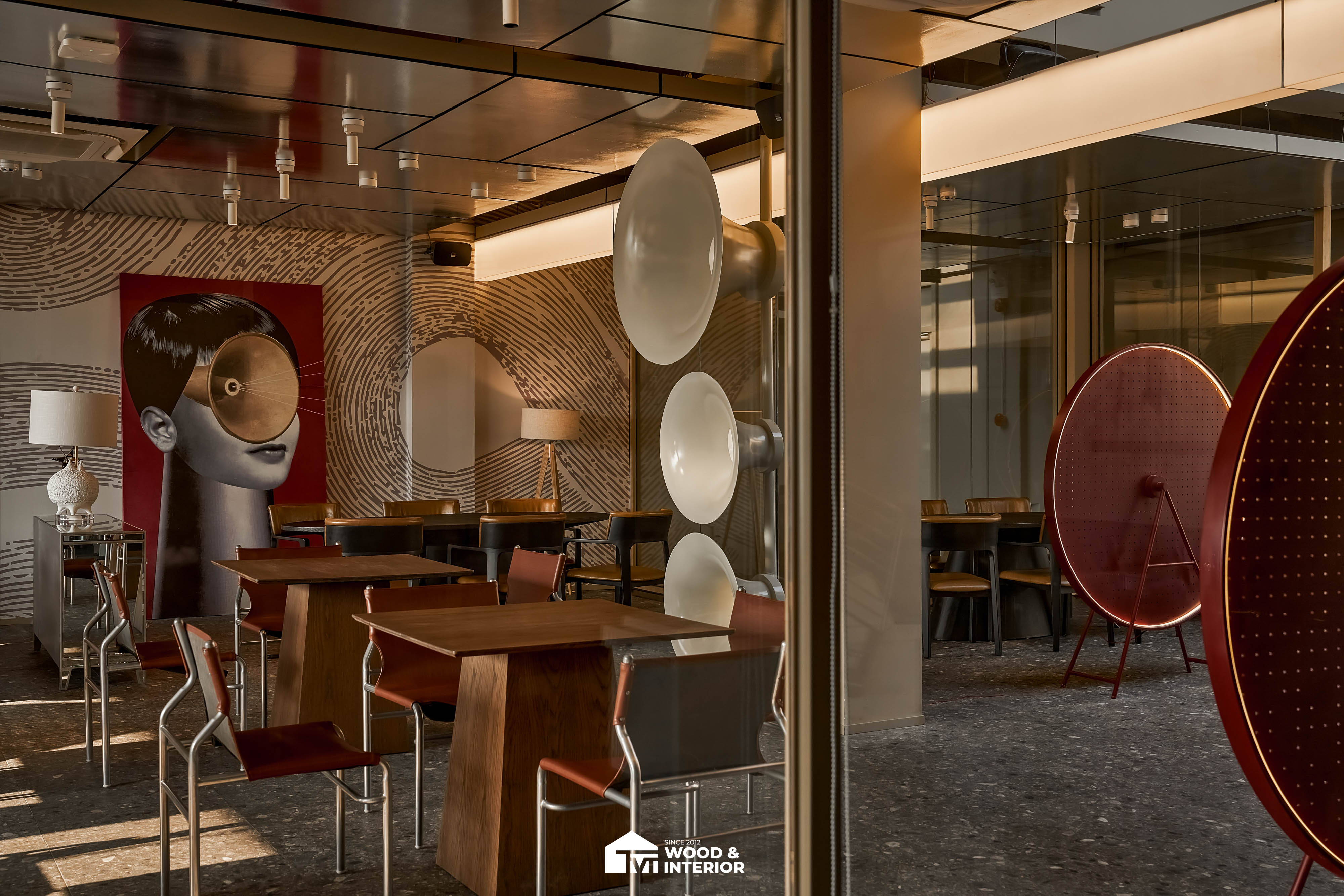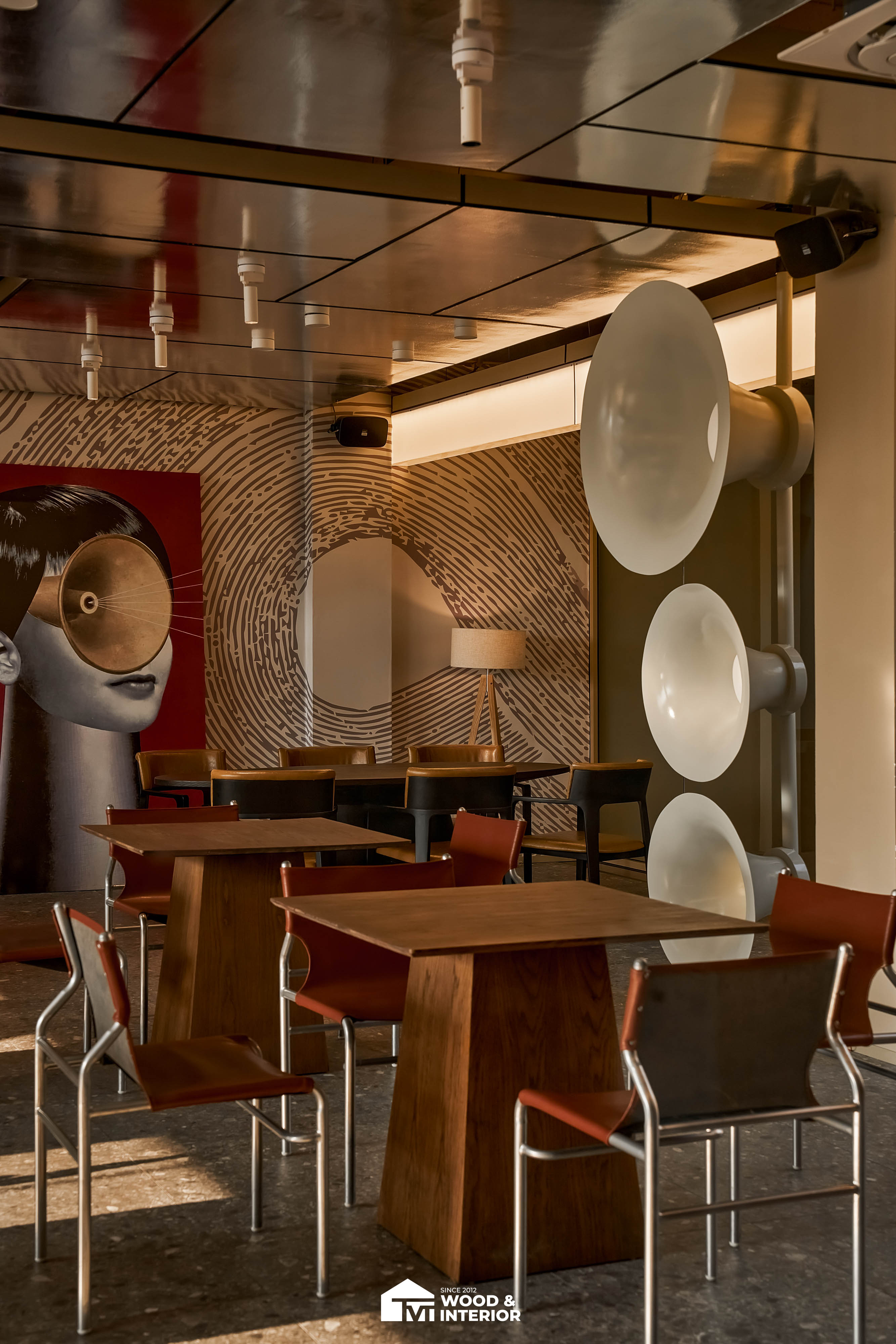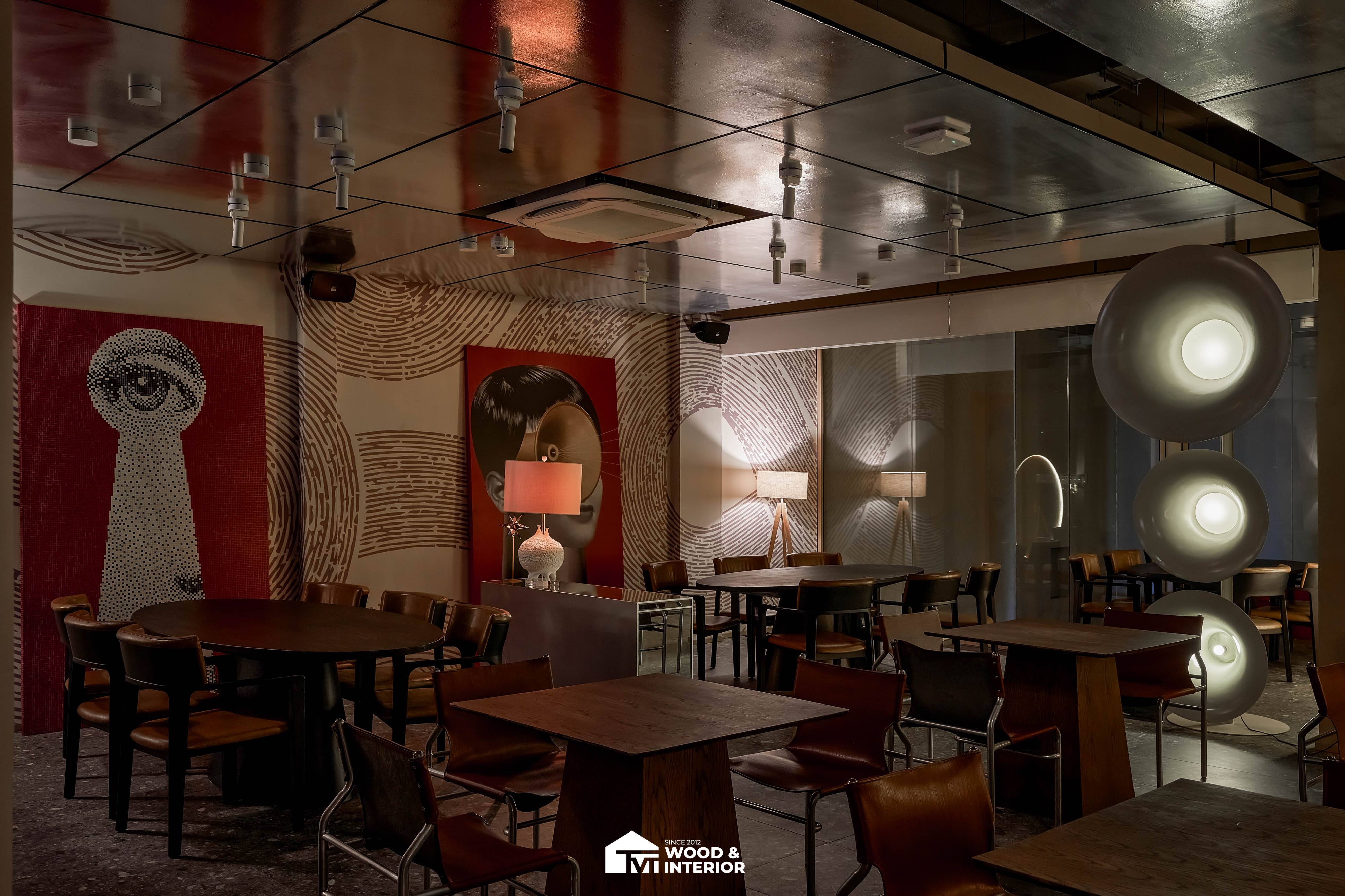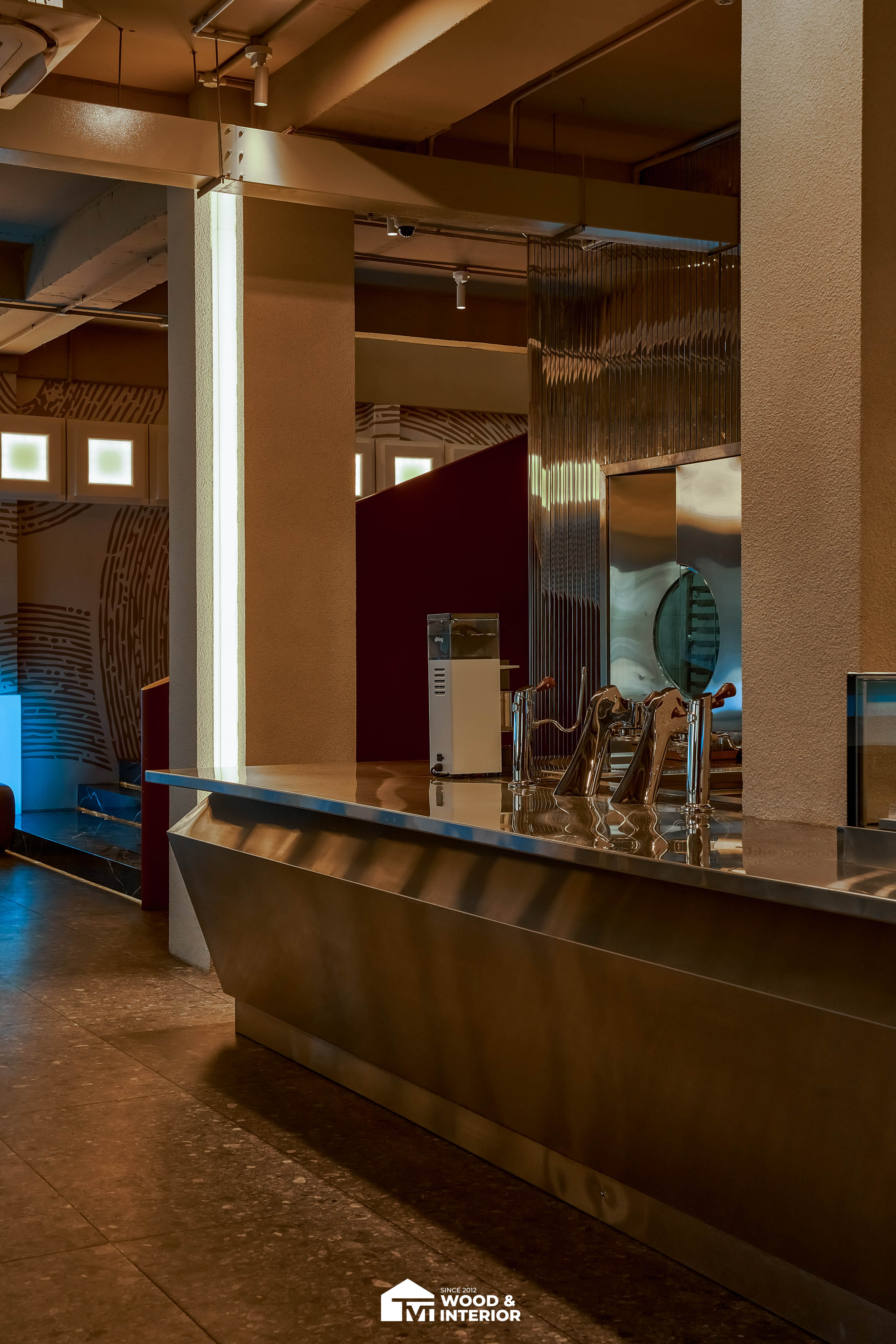 Điểm nhấn của dự án nằm ở các hạng mục nội thất trang trí đòi hỏi độ hoàn thiện sắc sảo. TVT trực tiếp sản xuất và lắp đặt hệ thống bàn ghế với đa dạng chất liệu, kiểu dáng độc đáo, đảm bảo sự kết nối hoàn hảo giữa công năng sử dụng và thẩm mỹ thị giác. Đặc biệt, phần trần inox gương và các mảng tường đồ họa Pop-Art được xử lý tỉ mỉ, tạo nên một tổng thể không gian phản chiếu ấn tượng hướng ra phía sông Hàn.