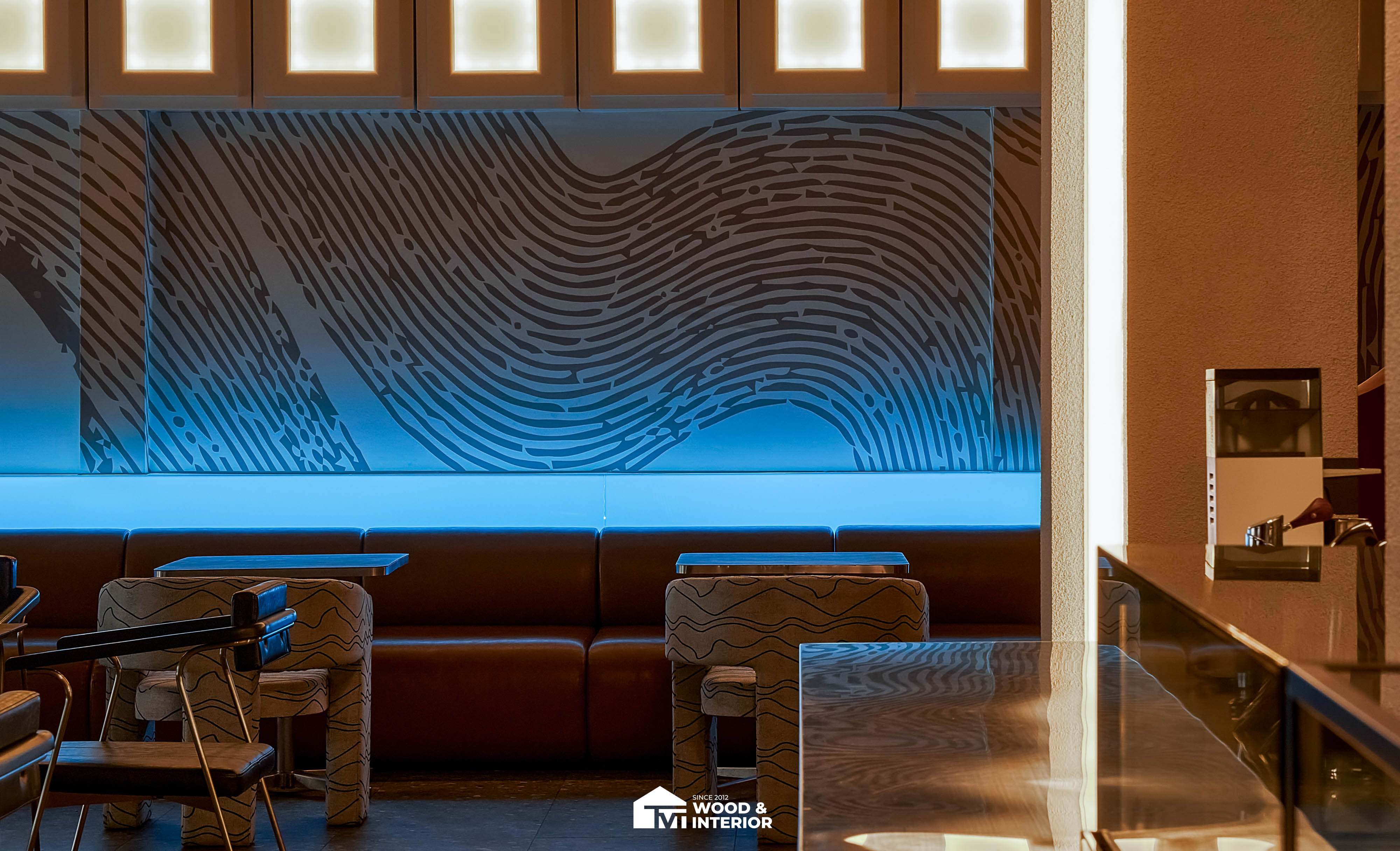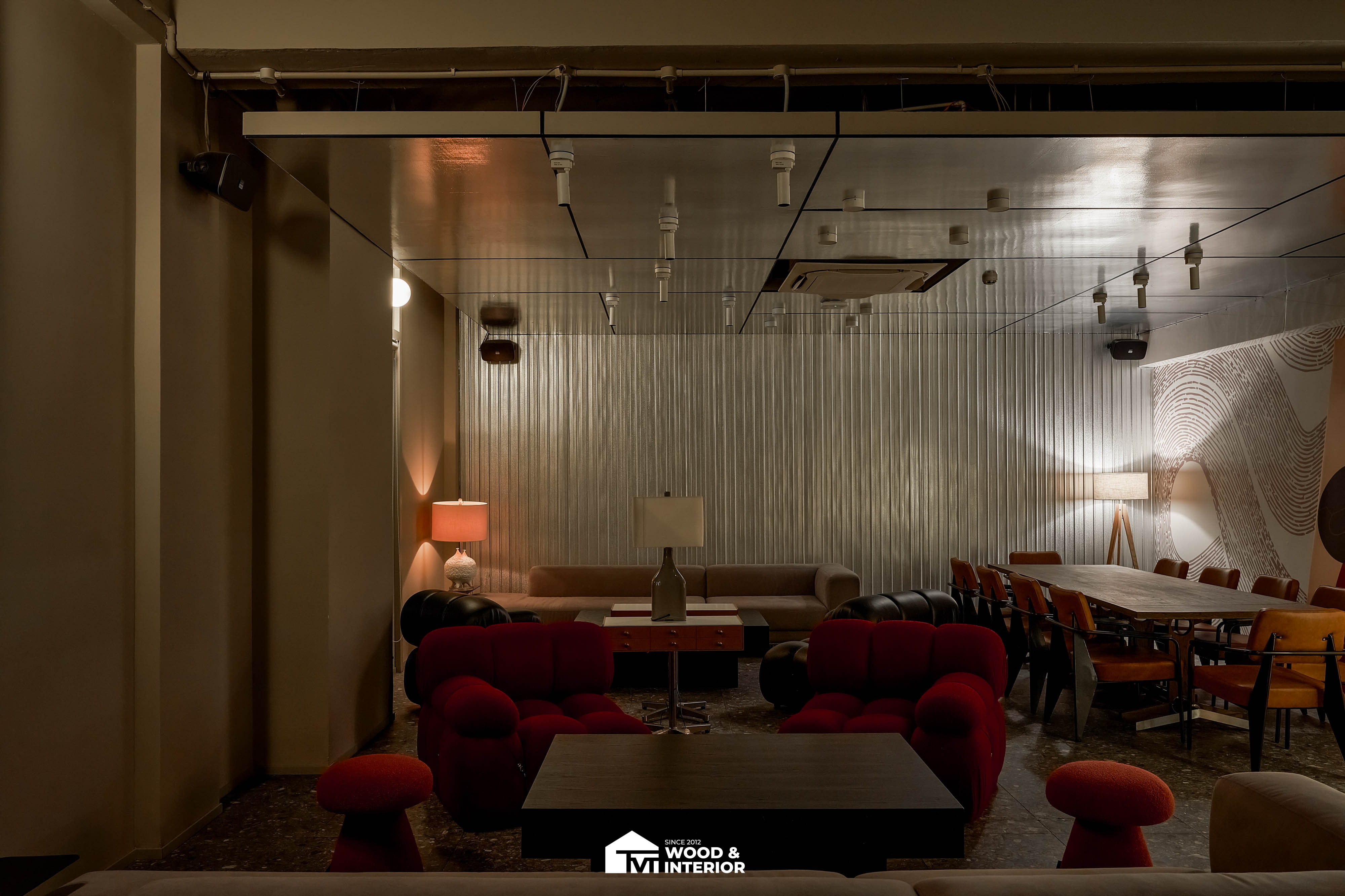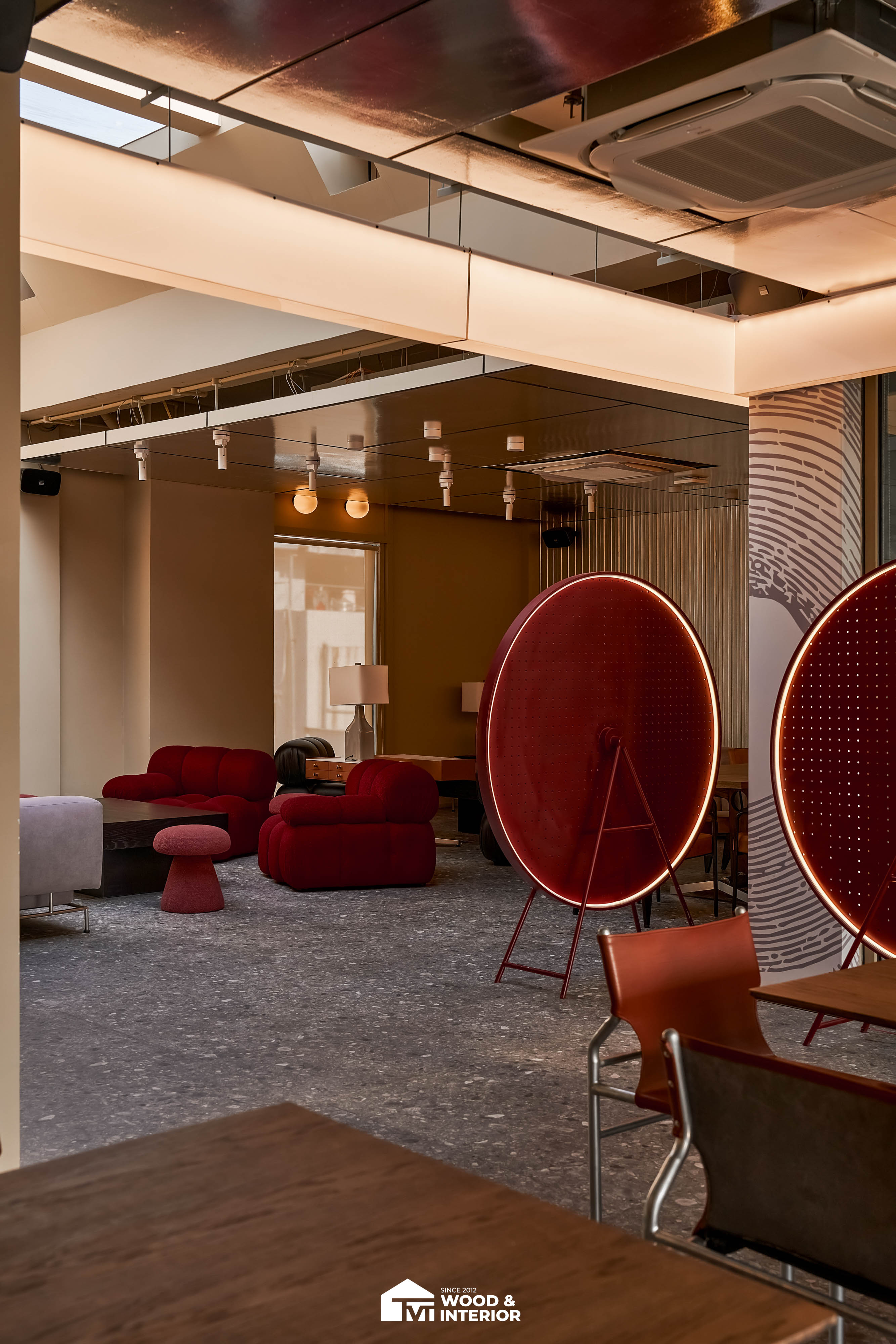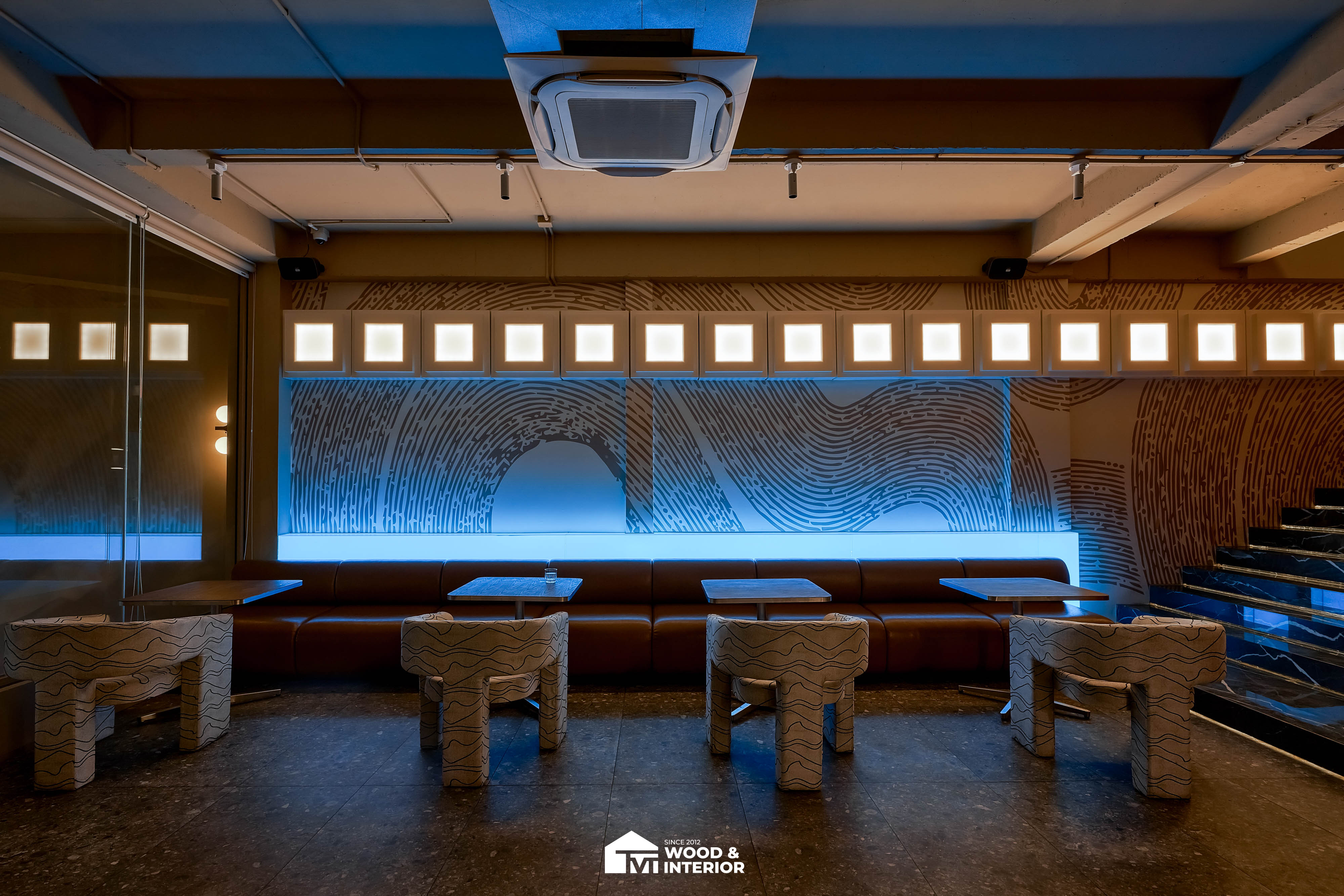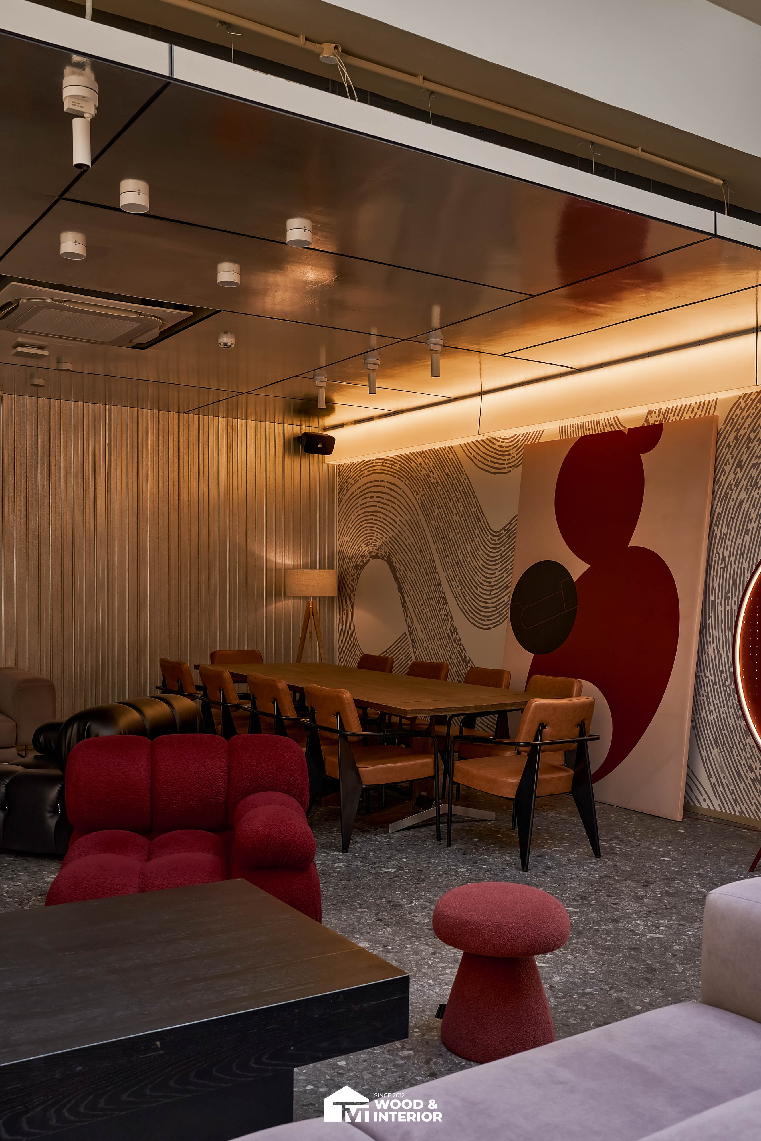 Điểm nhấn của dự án nằm ở các hạng mục nội thất trang trí đòi hỏi độ hoàn thiện sắc sảo. TVT trực tiếp sản xuất và lắp đặt hệ thống bàn ghế với đa dạng chất liệu, kiểu dáng độc đáo, đảm bảo sự kết nối hoàn hảo giữa công năng sử dụng và thẩm mỹ thị giác. Đặc biệt, phần trần inox gương và các mảng tường đồ họa Pop-Art được xử lý tỉ mỉ, tạo nên một tổng thể không gian phản chiếu ấn tượng hướng ra phía sông Hàn.