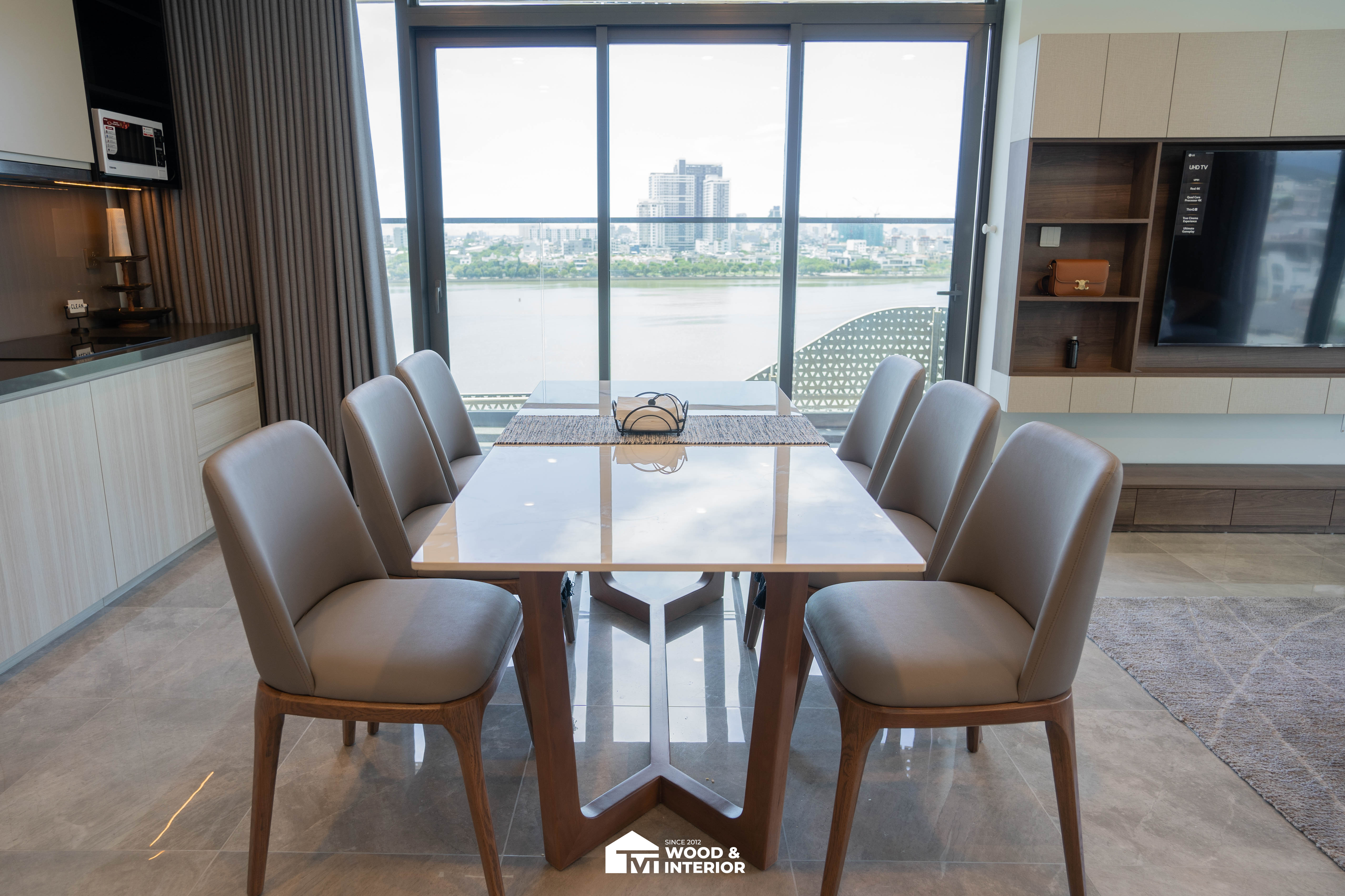 Căn hộ lần này là sự kết hợp hoàn mỹ giữa phong cách tối giản và tư duy tối ưu hóa diện tích. Không gian sống toát lên vẻ sang trọng, điềm đạm với sự lên ngôi của tông màu trung tính phối cùng các chi tiết giả da và gỗ nâu trầm ấm. Điểm nhấn riêng biệt nằm ở hệ tủ TV kịch trần với thiết kế âm tủ thông minh, không chỉ giải quyết bài toán lưu trữ mà còn tạo nên một diện mạo phẳng, gọn gàng tuyệt đối cho phòng khách.