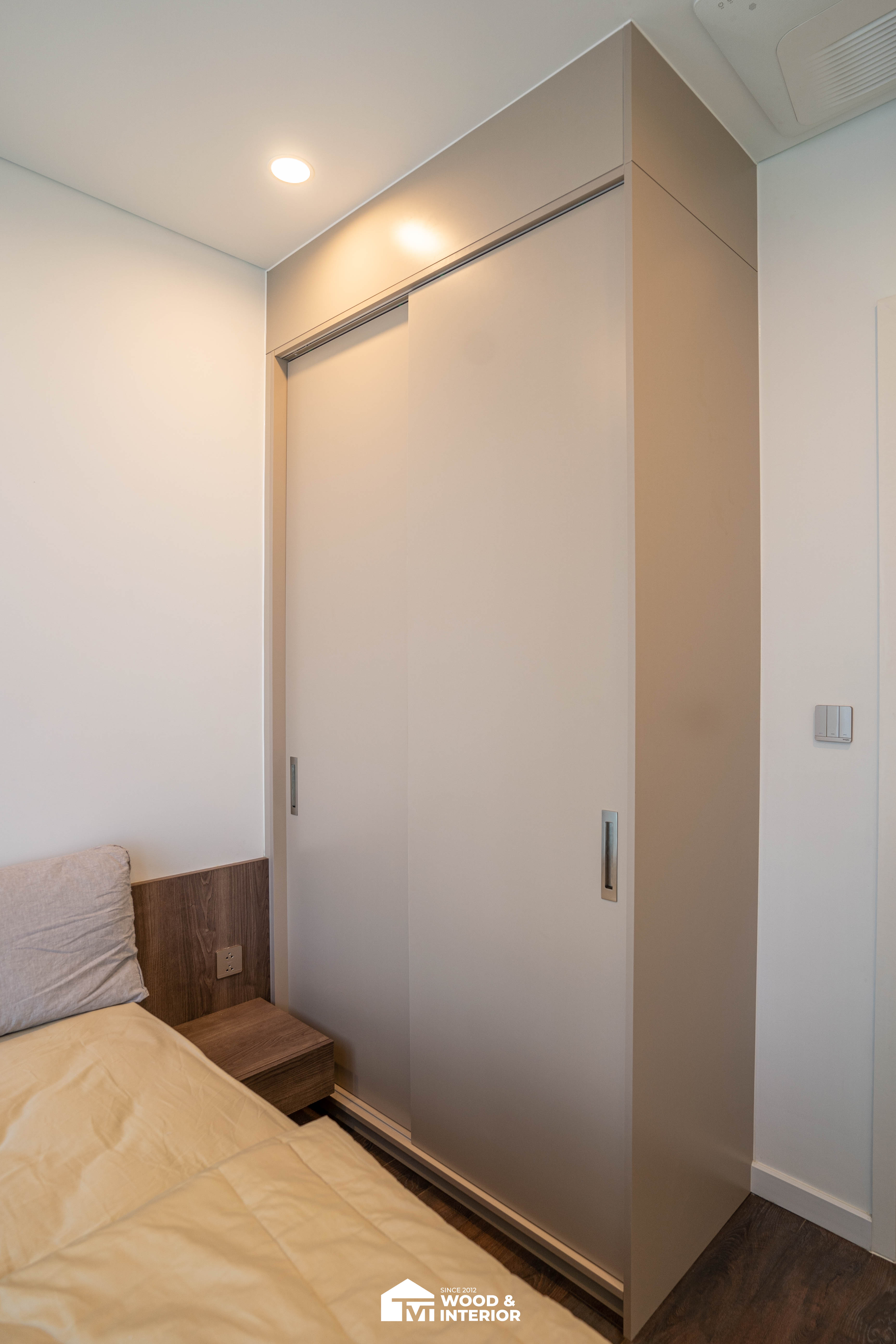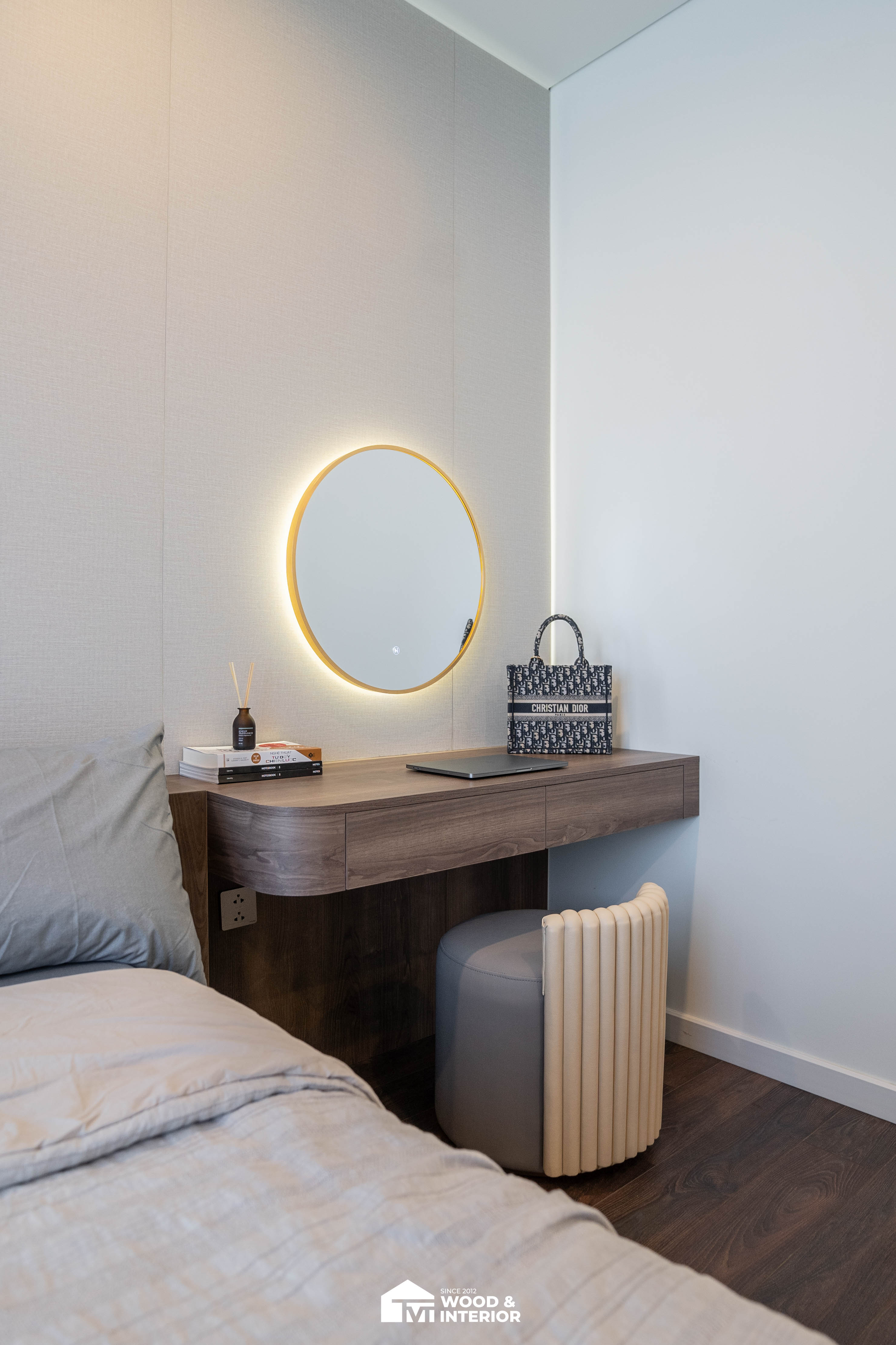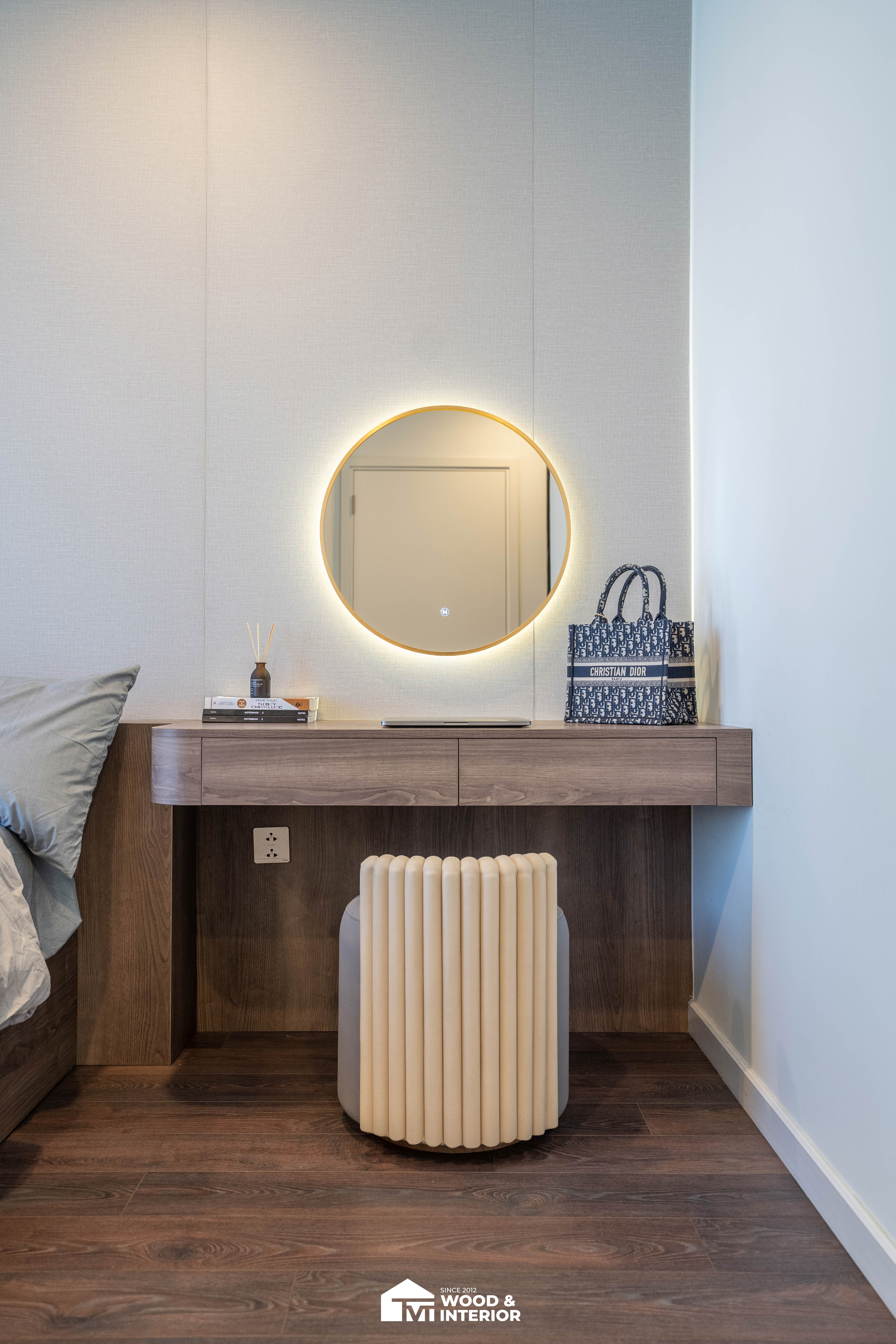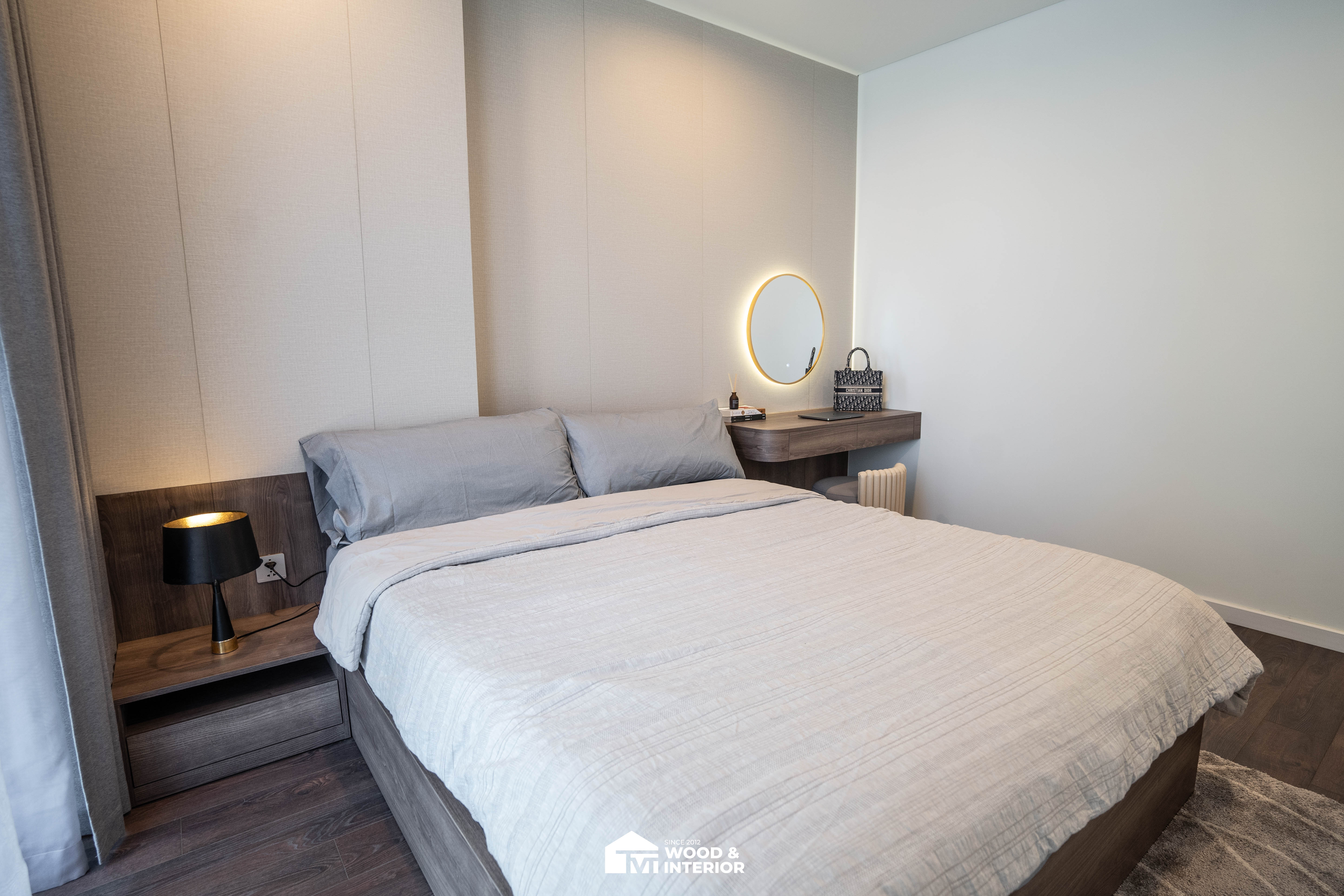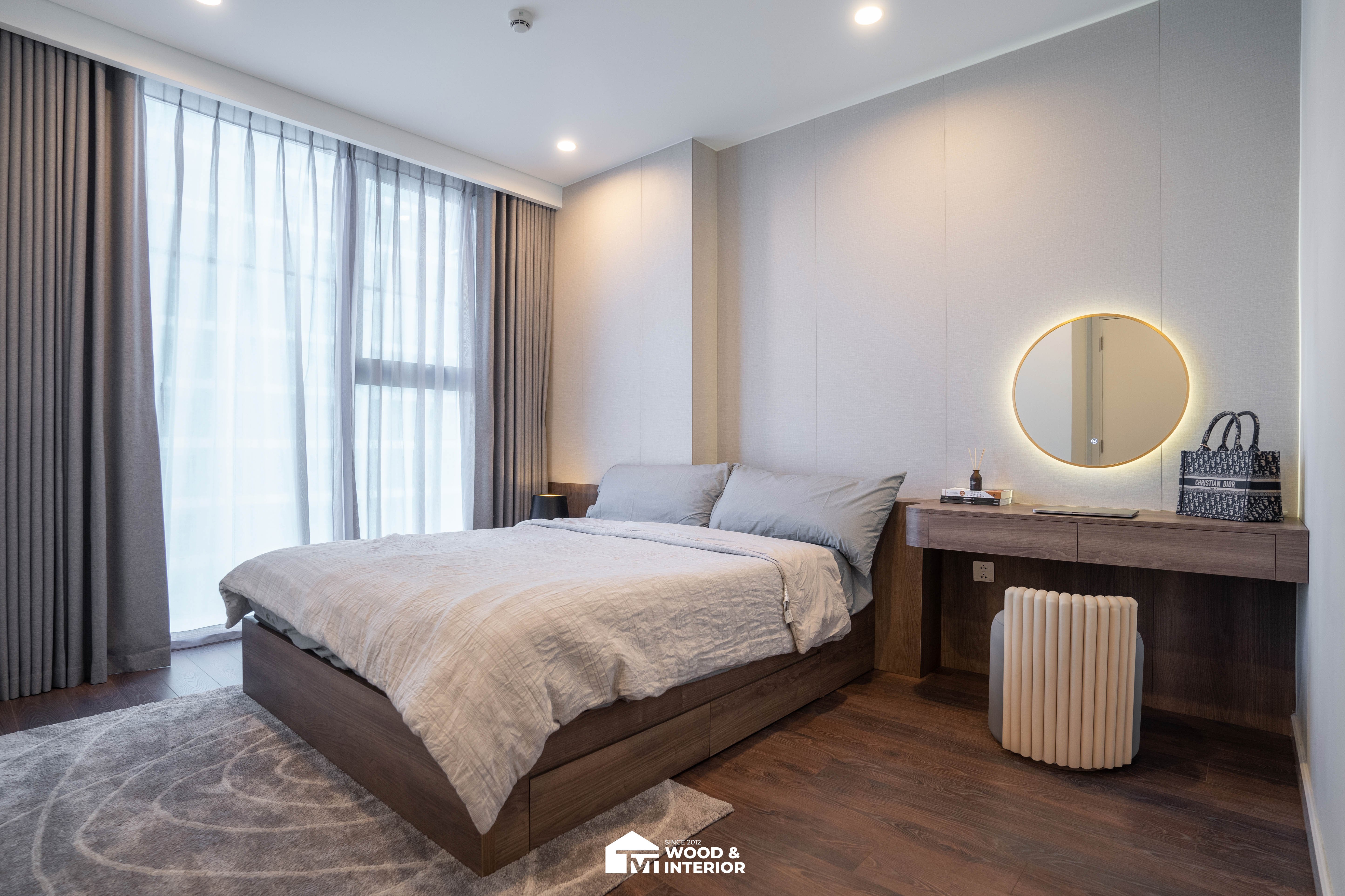 Trong khi đó, phòng ngủ mang đậm dấu ấn cá nhân với bàn trang điểm treo tường mềm mại và gương tròn LED hiện đại, biến những góc nhỏ thành nơi thư giãn đầy cảm xúc. Từng đường nét thi công sắc sảo từ TVT đã biến căn hộ thành một không gian sống đẳng cấp, nơi sự tiện nghi và thẩm mỹ luôn song hành trong từng chi tiết.