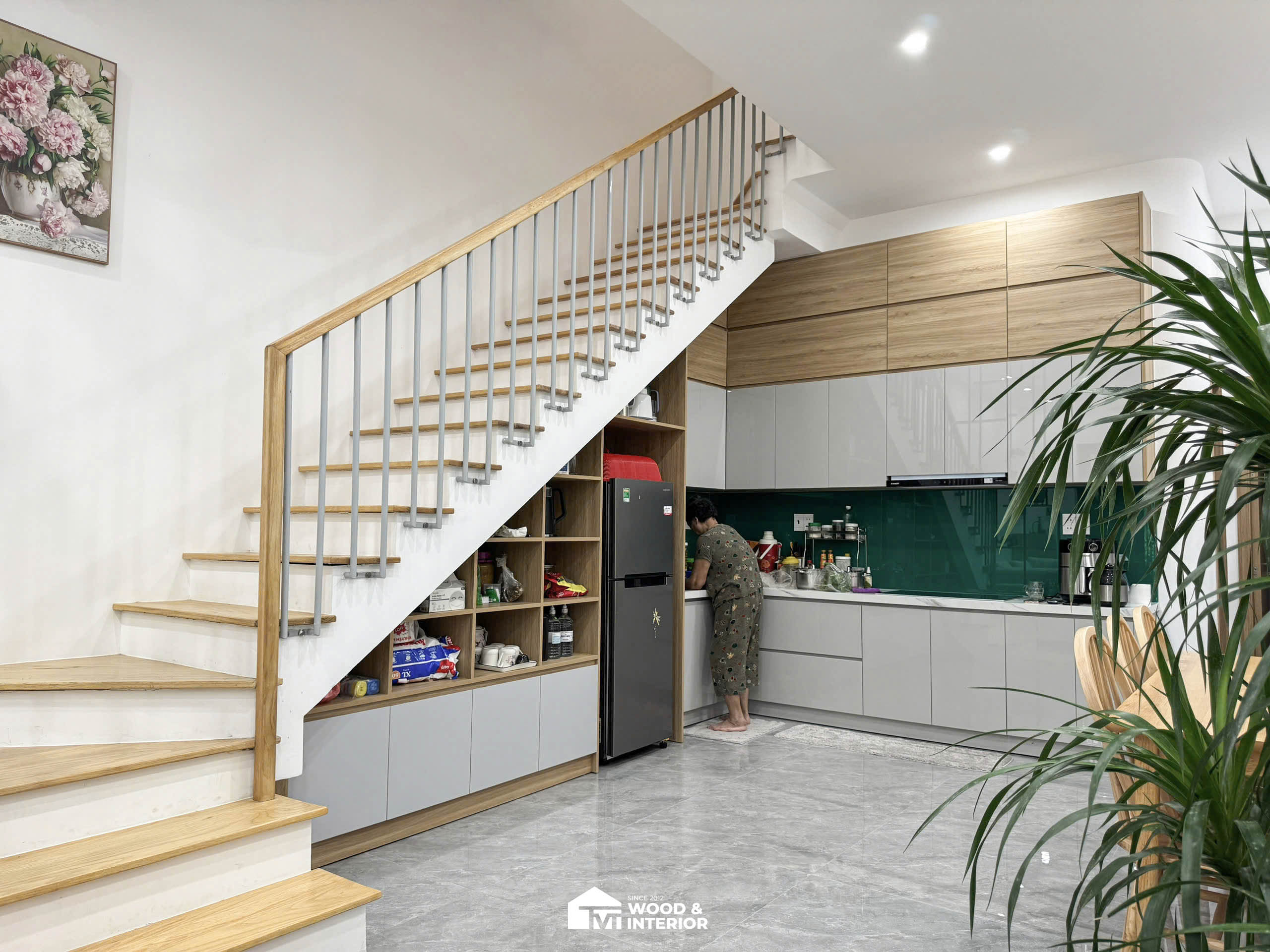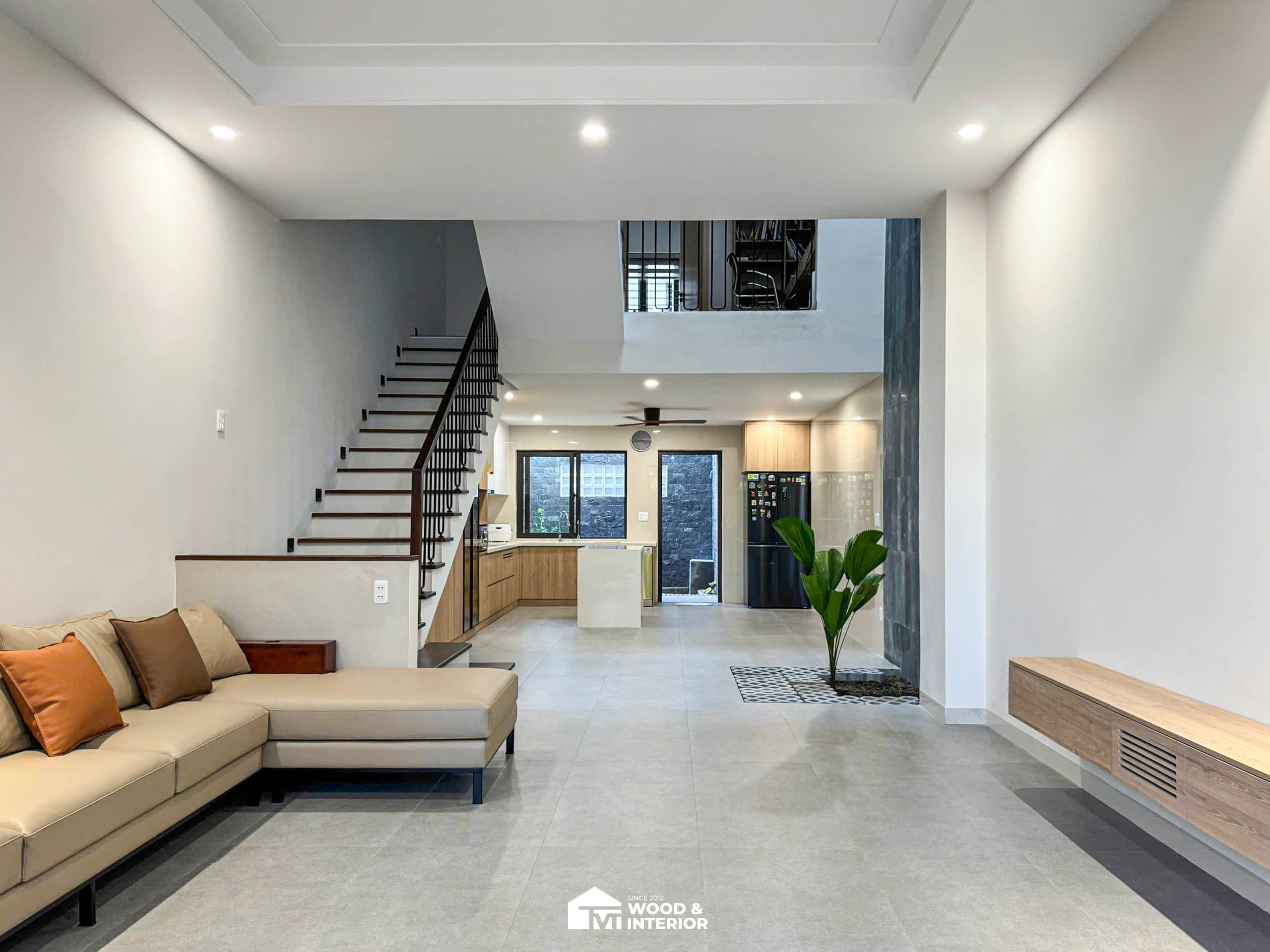 Công trình nội thất nhà phố này là chuẩn mực của phong cách hiện đại với sự kết hợp tinh tế giữa tông màu trung tính và chất liệu gỗ sáng ấm áp. Không gian phòng khách gây ấn tượng bởi bộ sofa chữ L trang nhã đối lập với bàn trà đá marble đen sang trọng, tạo nên điểm nhấn thị giác mạnh mẽ trong một tổng thể mở và thông thoáng.